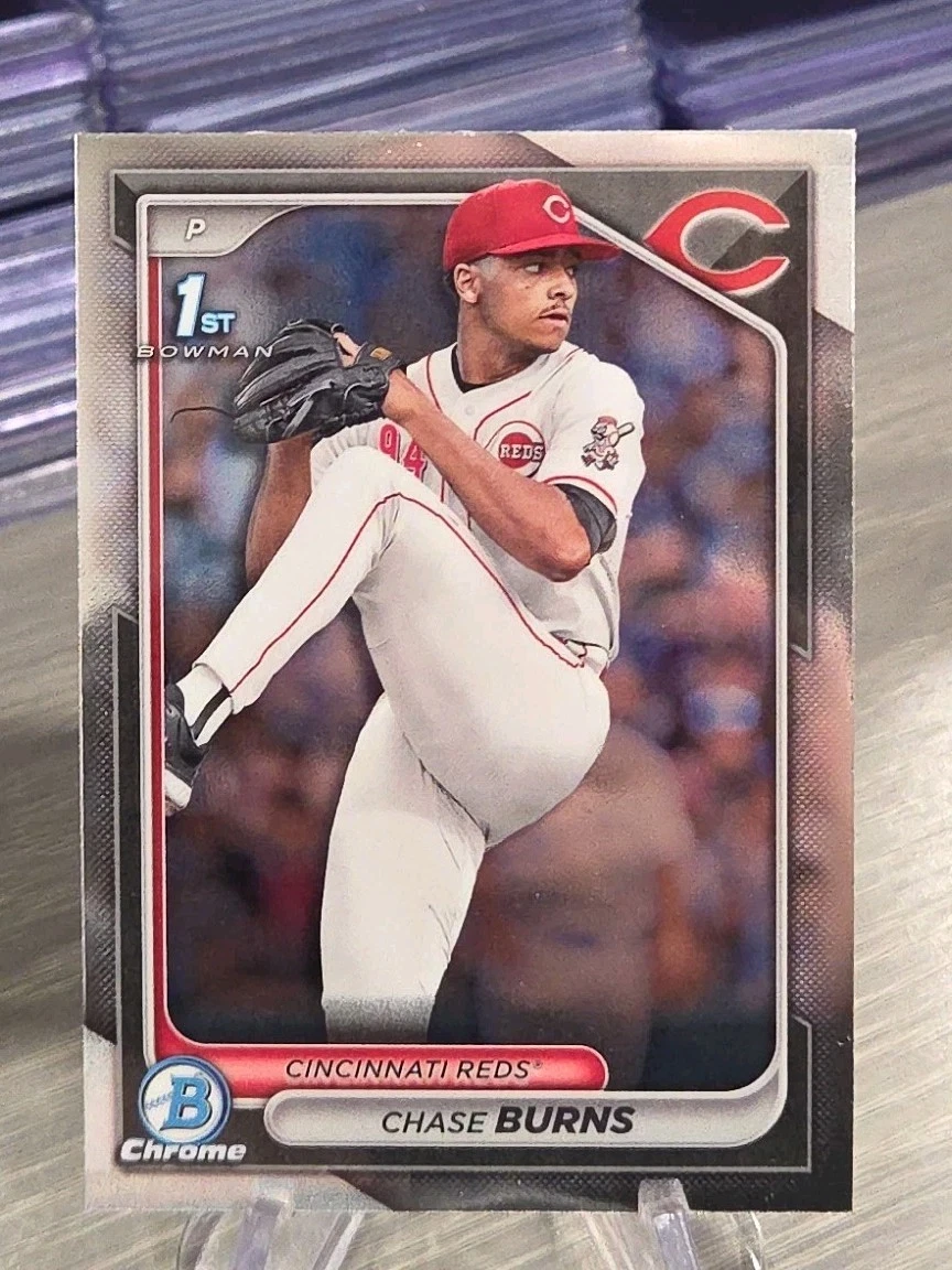 Chase Burns rookie cards center on his 1st Bowman Chrome autos from 2024 Bowman Draft and his true RC-logo cards in 2025 Topps and Topps Chrome. As a high-profile pitching prospect, his cards can move quickly with performance news and MLB debut timing. Prices vary by set, parallel, and grade, so use recent sales context and compare the exact version before you buy.
