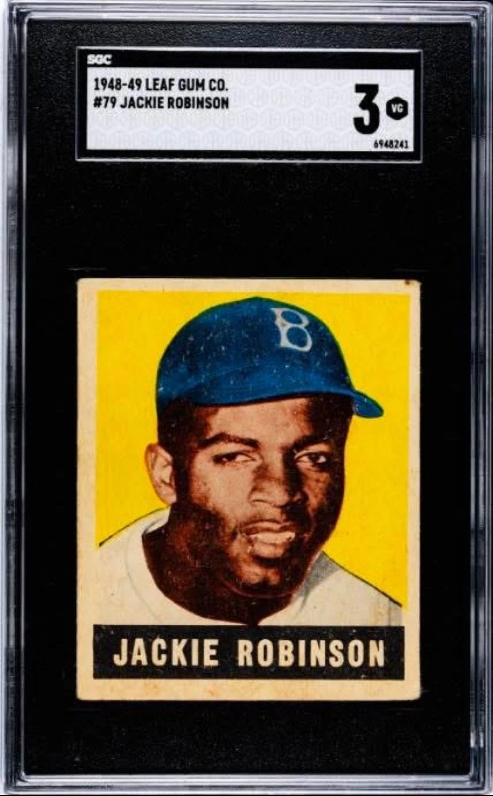 Jackie Robinson’s 1948 Leaf #79 rookie card is a blue-chip vintage icon. High grades are rare and expensive, while lower grades and early alternatives like Bond Bread and Bowman keep entry points open for more collectors.