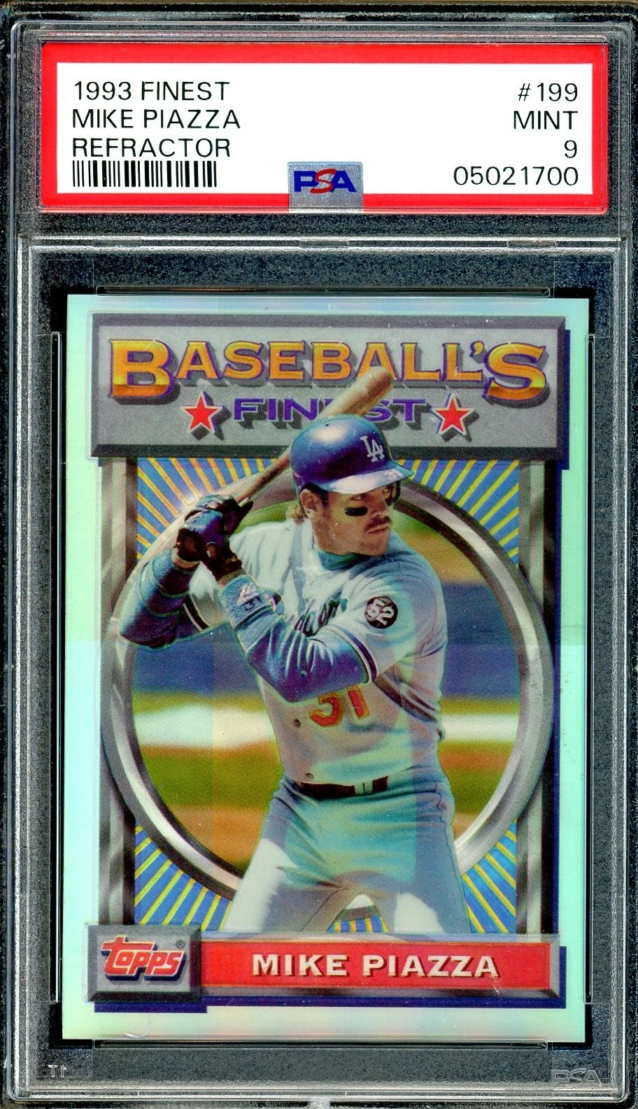Mike Piazza emerged as a superstar right as the "Junk Wax" era was ending and the premium insert era was beginning. His core 1992 rookie cards from Bowman and Fleer Update are the foundation of any collection, but his 1993 releases—specifically the Topps Finest Refractor—often drive the highest high-end values.