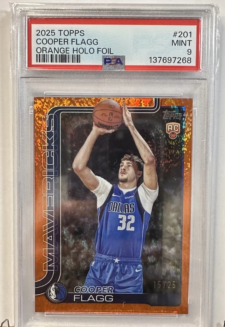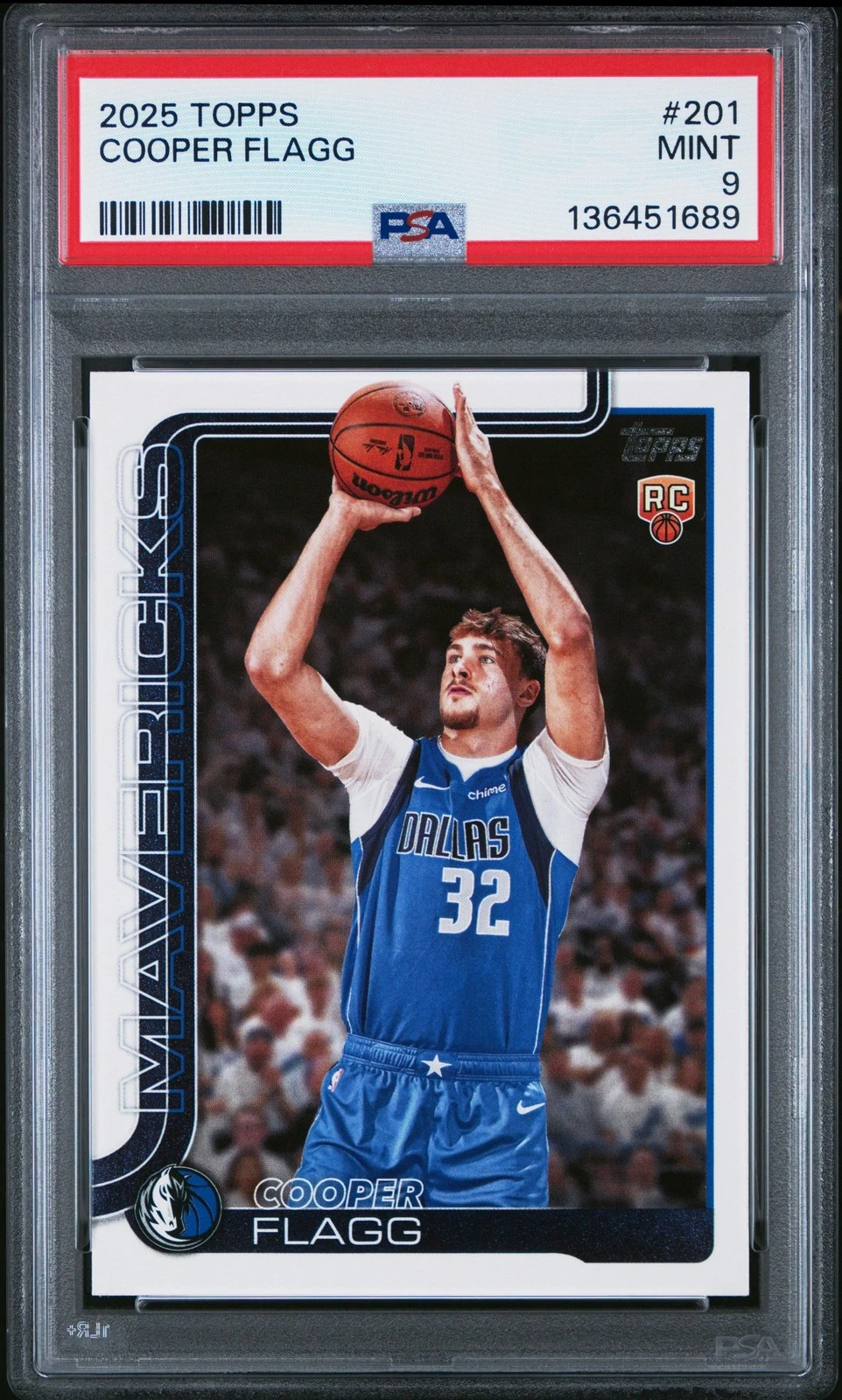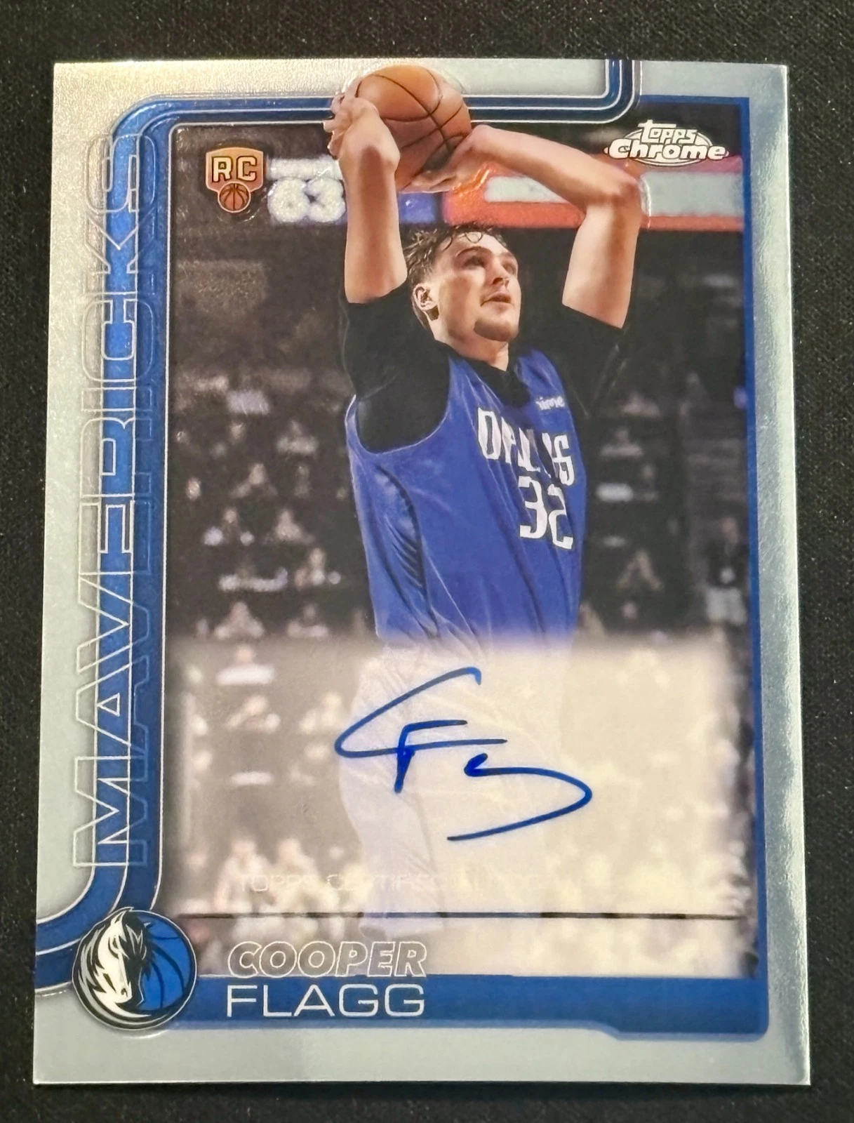 Cooper Flagg, often called Coop and nicknamed The Maine Event by some fans, entered the NBA as a high-profile forward and quickly became a focal point for modern basketball collectors. That demand usually concentrates around easy-to-search rookie numbers first (Topps #201 and Topps Chrome #251), then moves up the ladder into low-serial parallels and rookie autographs once collectors decide they want a single “best card” to hold long-term.