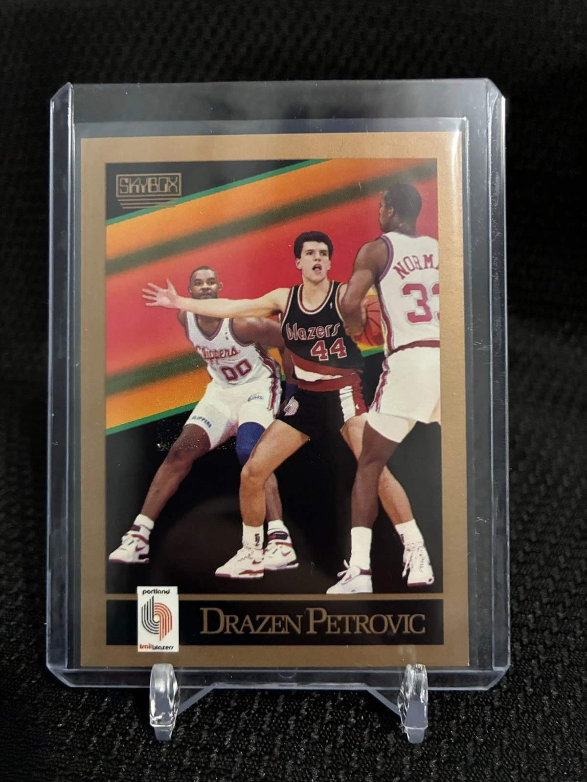 Drazen Petrovic rookie cards center on his 1990-91 Hoops, SkyBox, and Fleer Update releases, which offer an affordable Hall of Fame PC with most raw and mid-grade copies under $100 and gem-mint slabs for key cards pushing into low three-figure territory.