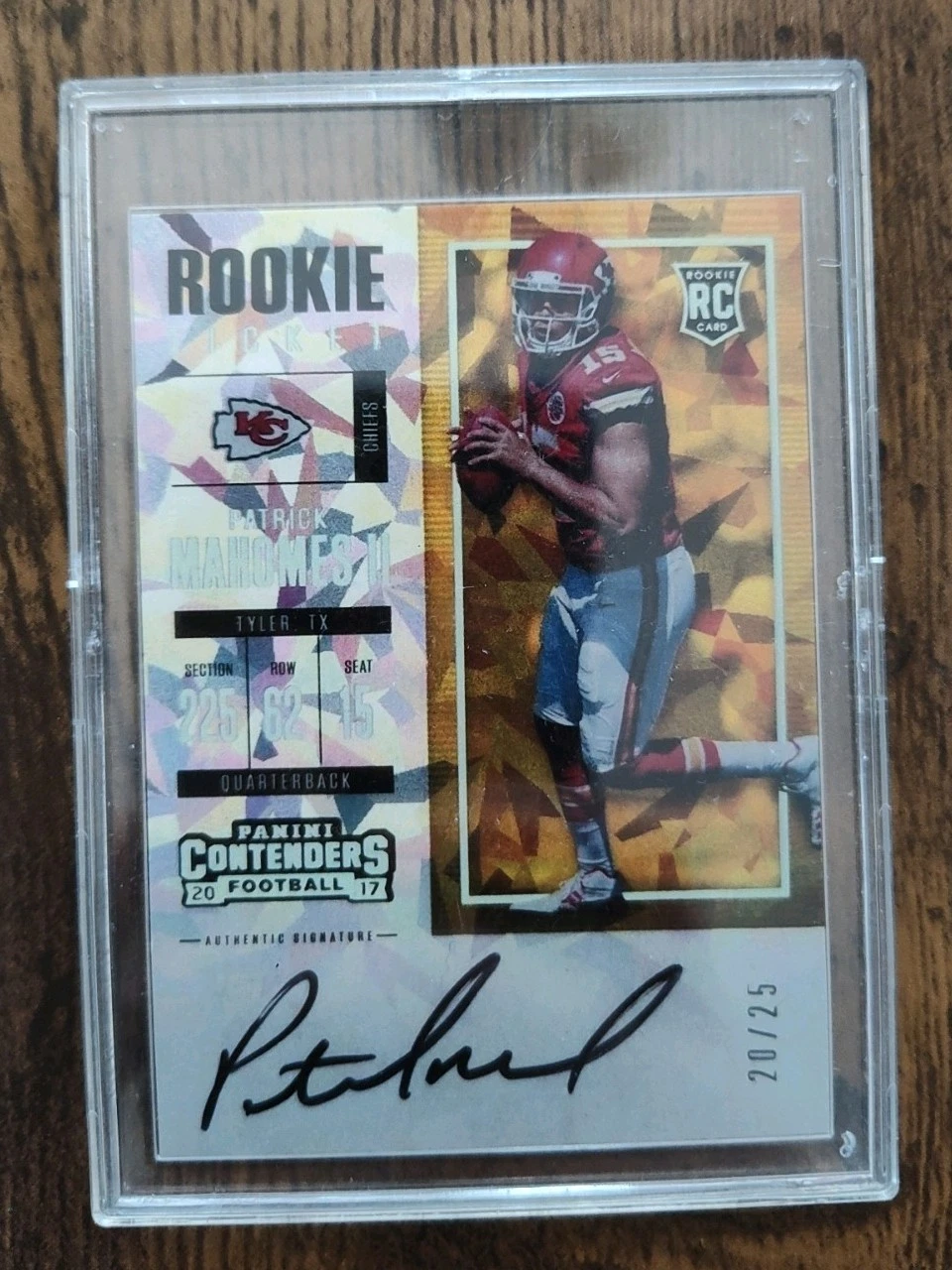 Mahomes rookies see heavy grading volume, especially Prizm, Donruss Optic, and Contenders autos. High grades on chromium base and low-serial autos can bring large premiums, while strong-looking raw copies are still in demand with collectors who prefer to grade themselves.