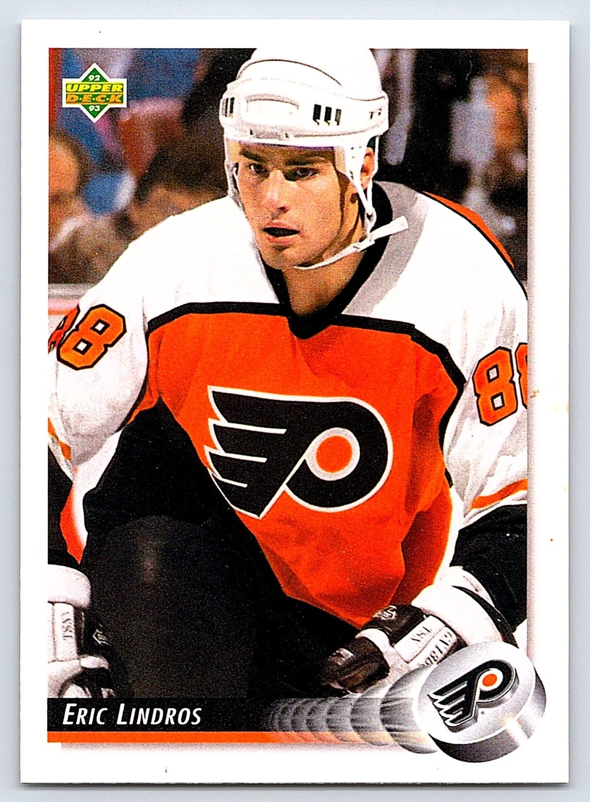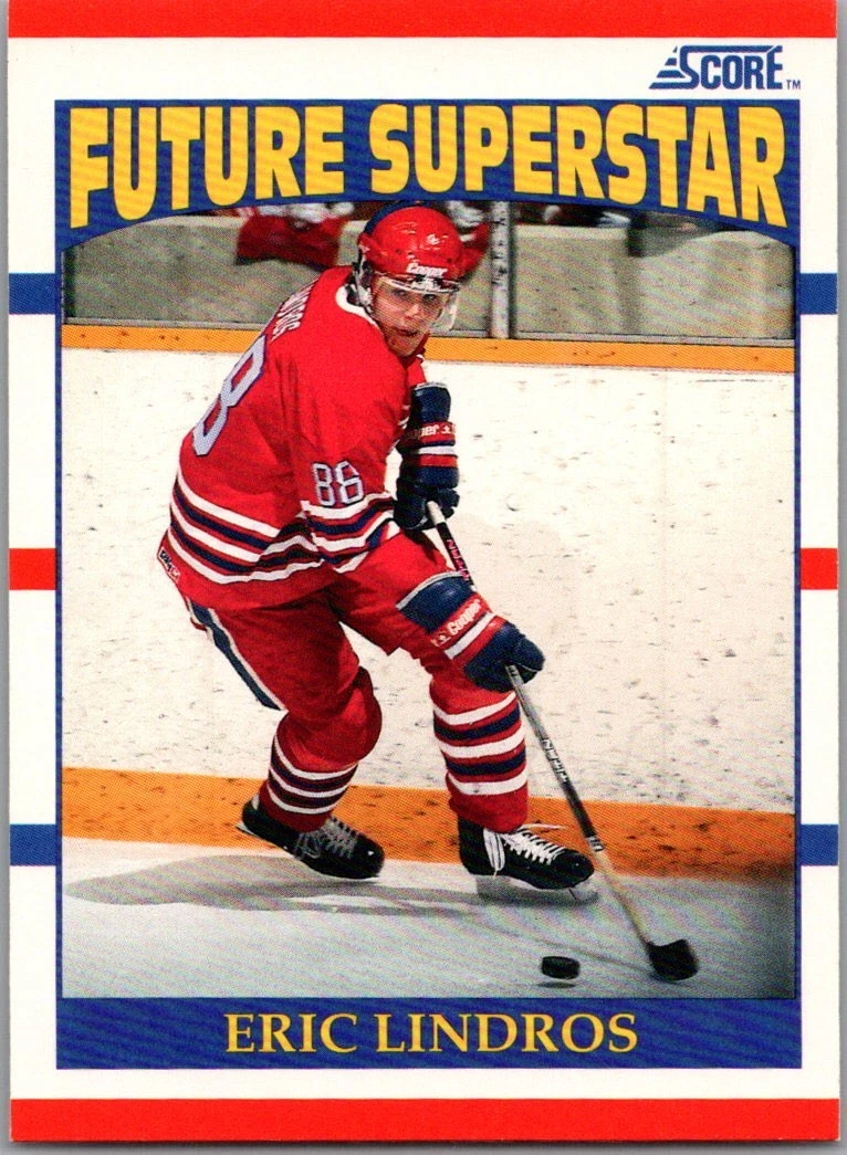 If you want the true Eric Lindros rookie-year card in a Flyers uniform, start with 1992-93 Upper Deck #88. For the famous early Lindros rookie collectors still chase, 1990-91 Score #440 (Future Superstar) is the classic Team Canada card.