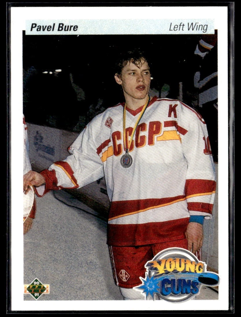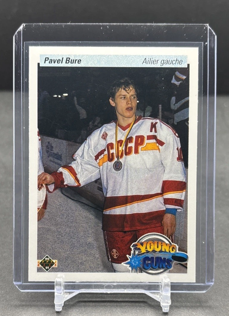 Early 90s hockey RCs are driven by brand, condition, and grade. The 1990‑91 Upper Deck Young Guns and 1990‑91 O‑Pee‑Chee Premier are the most collected Pavel Bure rookie issues; gem grades carry strong premiums. Centering, chipping on dark borders, and print quality matter.